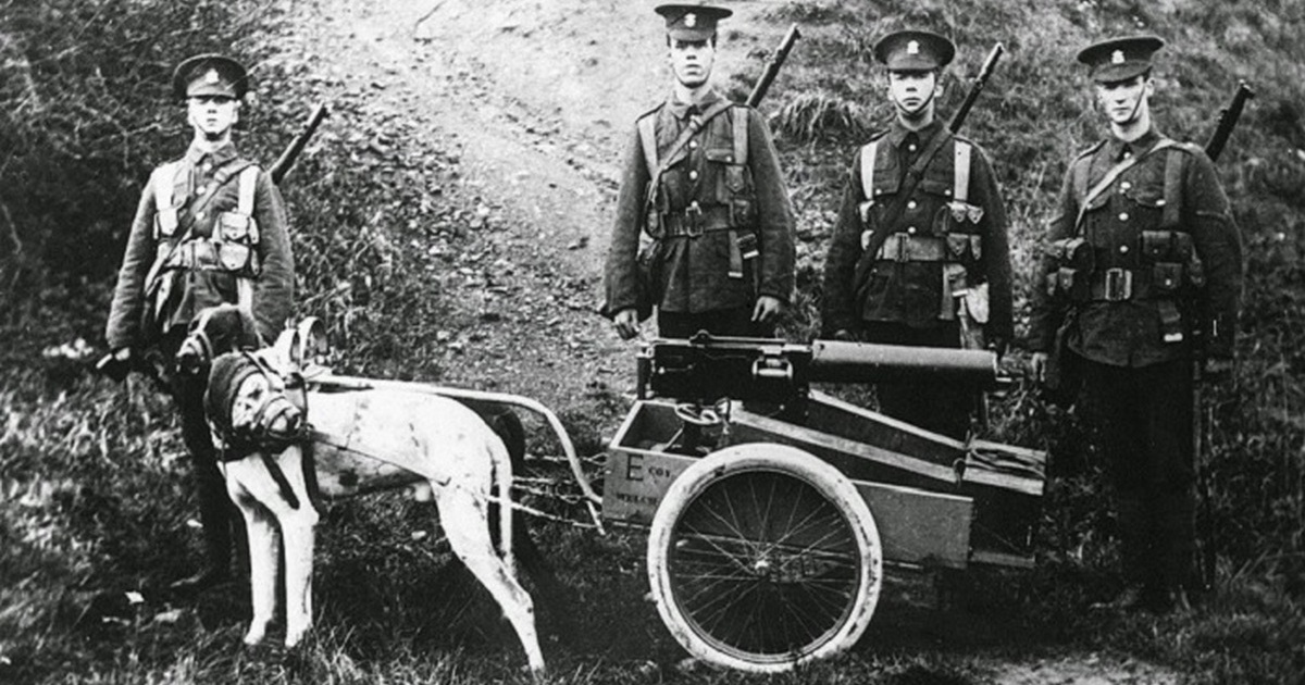Пулемётный расчёт англичан с пулемётом «Виккерс» на собачьей упряжке. Западный фронт, август 1914 года.