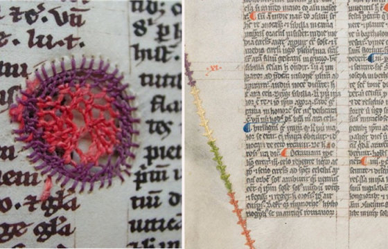 В раннем Средневековье до того, как было изобретено книгопечатание, книги писались на пергаменте – специальном материале, который получали из сыромятной шкуры овец, баранов, свиней и других домашних животных. Во время изготовления пергамента шкуры высушивали и тщательно скоблили, от чего на «страницах» часто появлялись разрезы и дыры. Чтобы реанимировать ценные листы, мастера приноровились «зашивать» дыры при помощи разноцветных шелковых нитей.