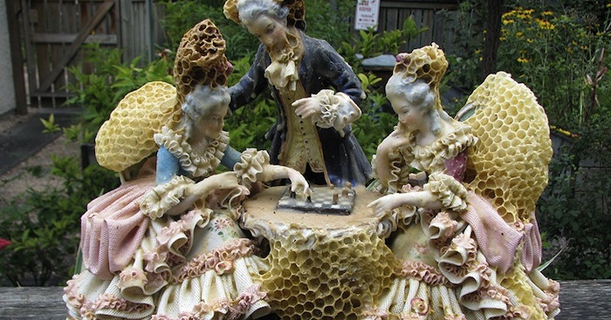 Канадская художница из Манитобы Аганета Дайк (Aganetha Dyck) давно увлекается исследованиями в области межвидовых коммуникаций, в частности, последствиями, к которым может привести исчезновение пчёл с лица земли. Вместе с трудолюбивыми насекомыми, которые находятся в этом незавидном положении, художница создаёт деликатные арт-объекты, используя для этих целей фарфоровые статуэтки, обувь, спортивный инвентарь и другие бытовые предметы.