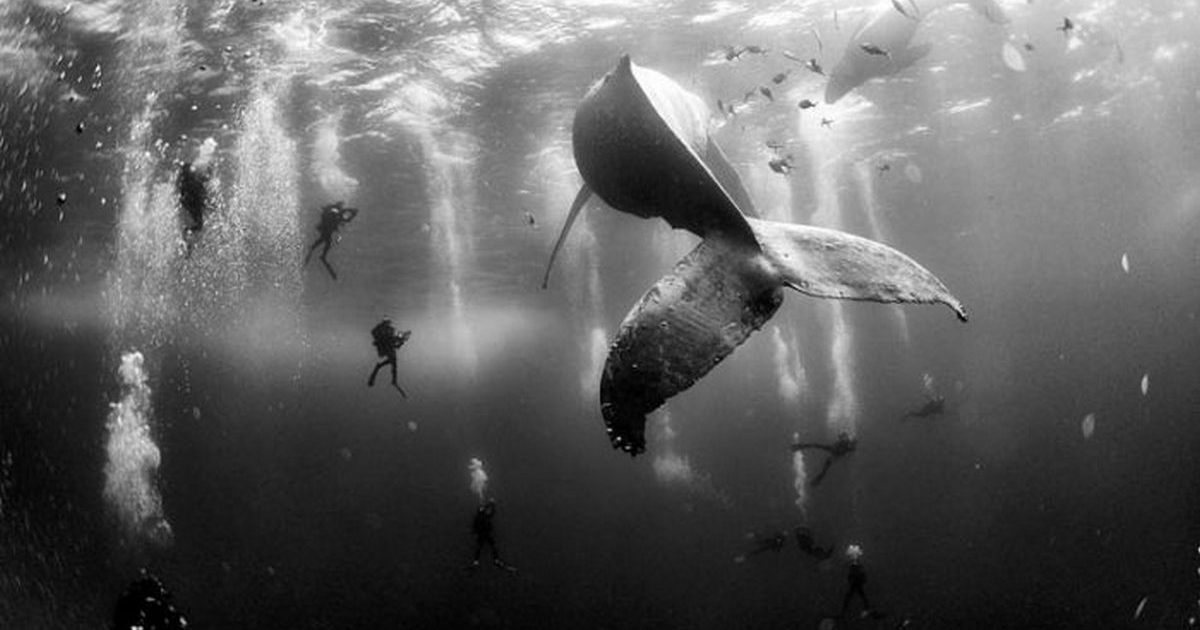 7. Дайверы и самка кита с детенышем