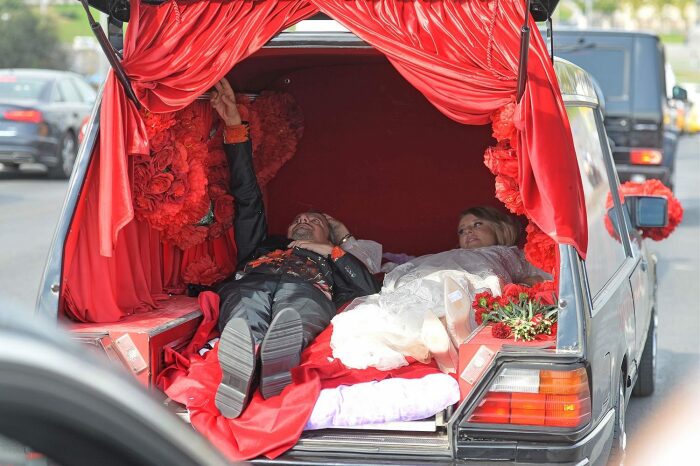 Ксения Собчак и Константин Богомолов в катафалке. / Фото: vedomosti.ru