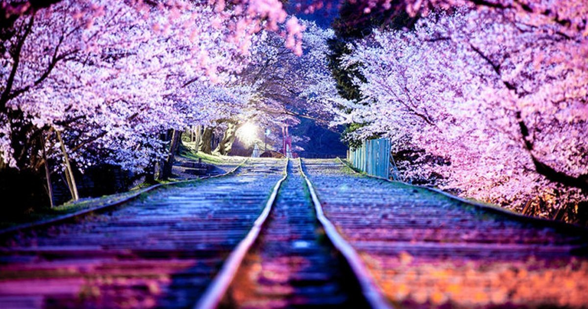 Заброшенные железнодорожные пути идеальное место для прогулок во время цветения сакуры.