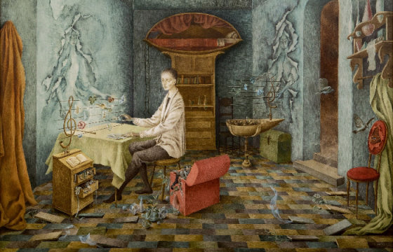 Он достаёт из сундука различные предметы: листья, цветы, раковины, прозрачные геометрические фигуры и обрывки бумаги с написанными от руки математическими цифрами, которые нанизывает на стереоскопическую музыкальную партитуру. Выражение лица композитора говорит о том, что он рассеян, как будто находится в полусне. Это полусонное состояние души позволило появиться из обоев женской фигуре, которая, незаметно для композитора, помогает распределить и настроить предметы на музыкальной партитуре.