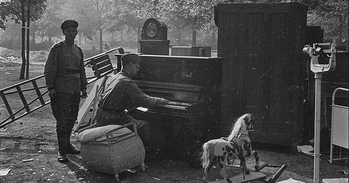 Советские солдаты играют на пианино в пригороде Берлина, май 1945 года.