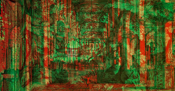 А вот картина Landscape n.1 содержит в себе изображения волшебного леса, готического собора и мифологического сюжета со множество персонажей-людей. И все это можно увидеть на одном холсте, посмотрев на него через правильные цветные очки.
