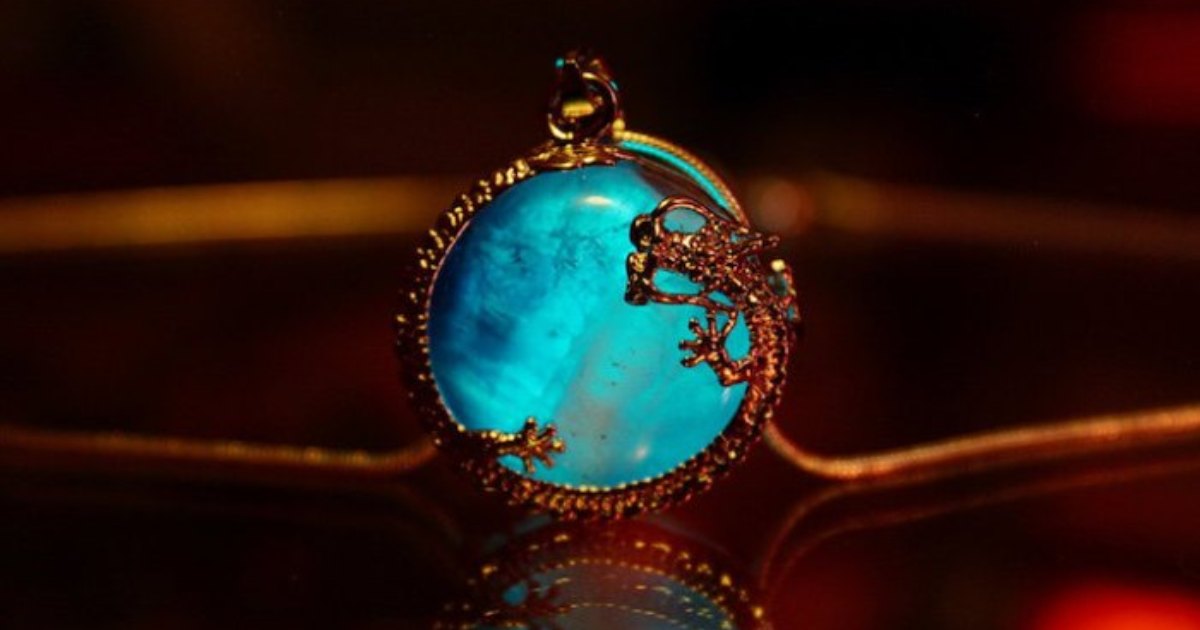 Характерная особенность украшений – все они светятся в темноте, производя мистическое впечатление. Для этого мастерица использует фосфоресцирующие материалы. Такие украшения достаточно подержать вблизи источника света или надеть днем, чтобы при наступлении темноты они стали светиться. Внутри одних украшений можно увидеть цветы или травы, другие дополнены изображениями из огненно-медной проволоки.