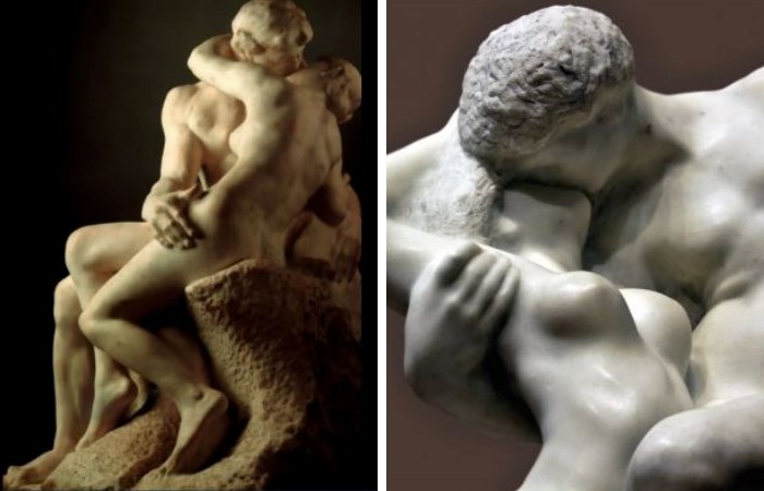 Одной из самых первых скульптур с изображением поцелуя стала скульптура Огюста Родена, которая вначале была частью его скульптурной группы «Врата ада», на которую скульптор потратил 37 лет, но так и не завершил ее. Позднее скульптура «Поцелуй», изображавшая тайных любовников Паоло и Франческу из «Божественной комедии» Данте, была представлена как самостоятельное творение, неординарное и провокационное для своего времени.