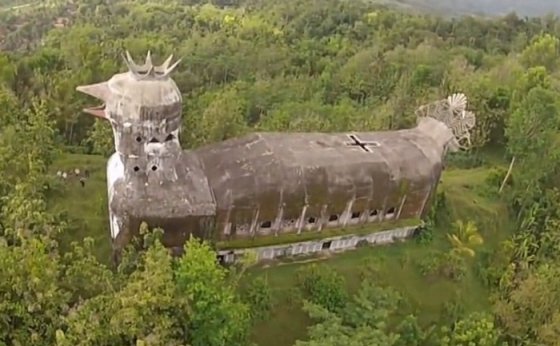 Возвышаясь над верхушками деревьев, в густой чаще лесов Индонезии находится необычное строение, напоминающее птицу. Это заброшенный молитвенный дом, известный как «Куриная церковь». Она была построена всего лишь 25 лет назад, но, за ненадобностью, прекратила свою деятельность. На сегодняшний день здание медленно превращается в руины, напоминая декорации к приключенческим фильмам.