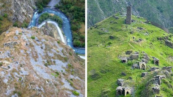 Одна из башен расположена наверху холма. Это вайнахская башня, которая часто встречалась на севере Кавказа. Ее задача контролировать проход в грузинском направлении через Аргунское ущелье. Специалисты были вынуждены ее отреставрировать, спасая от разрушения. Сами склепы располагаются на холме за башней. Там до сих пор можно найти останки людей, покинувших этот мир несколько веков назад. Трупы помещали на ярусы полок внутри склепов. В каждом могильнике есть окошко. Языческие святилища выложены из небольших камней. Там проводились жертвоприношения.