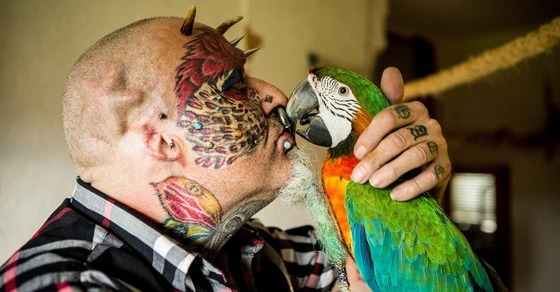 Британец Тед Ричардс, известный также как "человек-попугай", имеет на своем теле 110 татуировок, 50 разного рода пирсинга и семь имплантов. А кроме того, недавно он сознательно удалил себе ушные раковины, чтобы быть еще больше похожим на своих любимых попугаев. Эта операция длилась шесть часов. Теперь, когда дело сделано, Тед подумывает над тем, чтобы превратить свой нос в клюв...