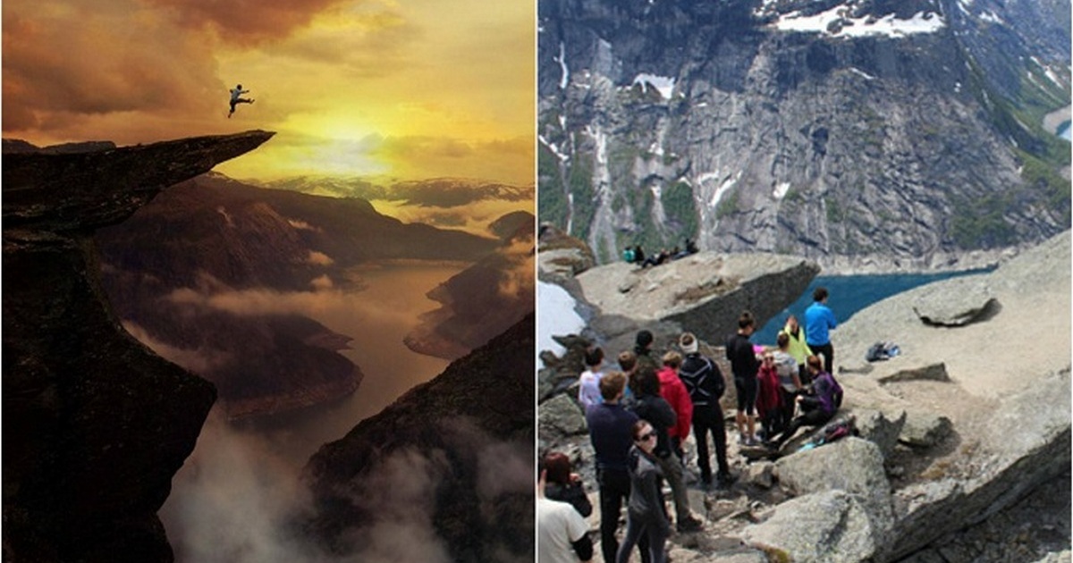 Каменный выступ на горе Скьеггедаль, расположенной вблизи города Одда в Норвегии, возвышающийся над озером Рингедалсватн на высоте 350 метров.
