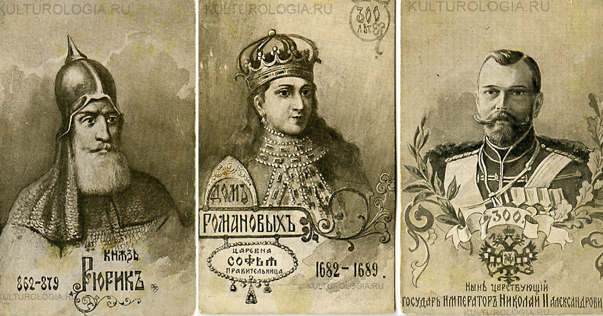За всю историю Государства Российского на троне сменился не один десяток правителей, и у каждого из них были свои особенности характера, свои тайны, и о каждом из них слагали легенды. В 1913 году, когда отмечали 300-летие Дома Романовых, был выпущен набор открыток, на которых изображались русские правители, начиная от Рюрика. Именно этими портретами, которые, кстати, были одобрены самим императором Николаем II, и проиллюстрирован это обзор.