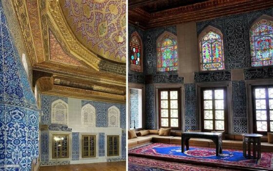 В главном помещении покоев, зале, можно бесконечно любоваться как витражными окнами, так и резным купольным потолком (он выполнен из дерева), и по-восточному шикарной мебелью, и, конечно, плиточными стенами. Кстати, на плитке можно увидеть (а тем, кто понимает арабский, и прочитать) айяты – коротенькие фрагменты из Корана.