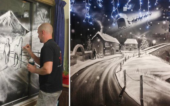 Вернувшись из солнечной Австралии на Туманный Альбион, Том Бейкер (Tom Baker) решил дарить людям рождественское настроение. 8 лет назад он освоил технику работы с так называемым «снежным» спреем и начал рисовать на окнах целые истории.