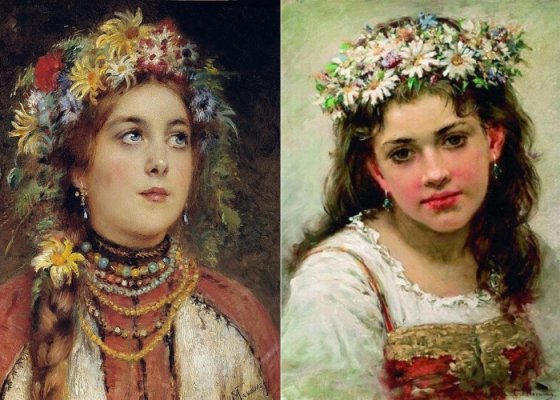 К. Маковский. Слева – *У околицы*. Справа – *За прялкой*