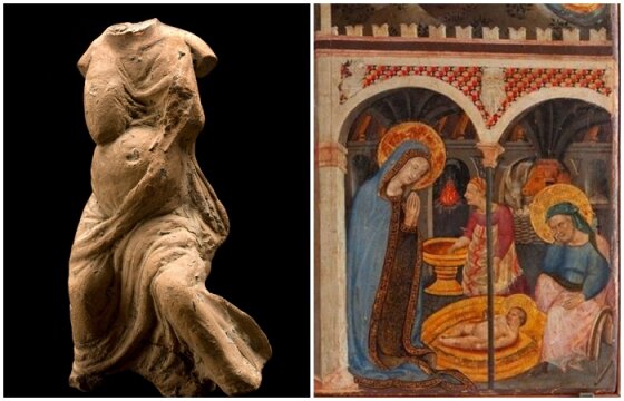 Слева на право: Николай из Толентино парит в облаках. \ Девушка, упавшая в чан с вином.