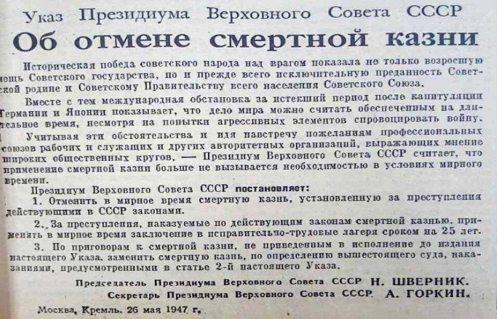 В 1947 году был издан Указ об отмене смертной казни, хотя все понимали, что это было сделано по велению Сталина. Согласно указу, смертная казнь заменялась 25 годами пребывания в трудовых колониях. Ранее самым большим сроком было 15 лет колоний, а выше только смертная казнь. Нововведение относилось и к тем, кому уже вынесли смертный приговор, но не успели привести его в исполнение. Казалось бы, мелочь, но она спасла очень много жизней. В постановлении говорилось, что в условиях мирного времени нет необходимости применять столь строгое наказание, хотя в это время велись расследования по военным преступлениям, об измене Родине, и было очень много лиц, которые заслуживали ее.