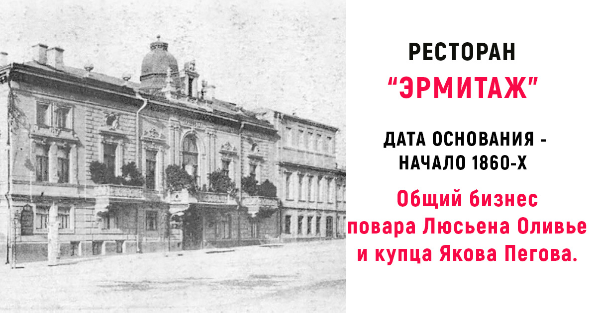 Ресторан «Эрмитаж» – один из немногих легендарных русских трактиров с отменной кухней и культом еды, которые язык не поворачивался назвать просто забегаловкой. Но была у «Эрмитажа» и своя изюминка: это был ресторан европейской авторской кухни, а еще именно здесь родился знаменитый салат «Оливье».