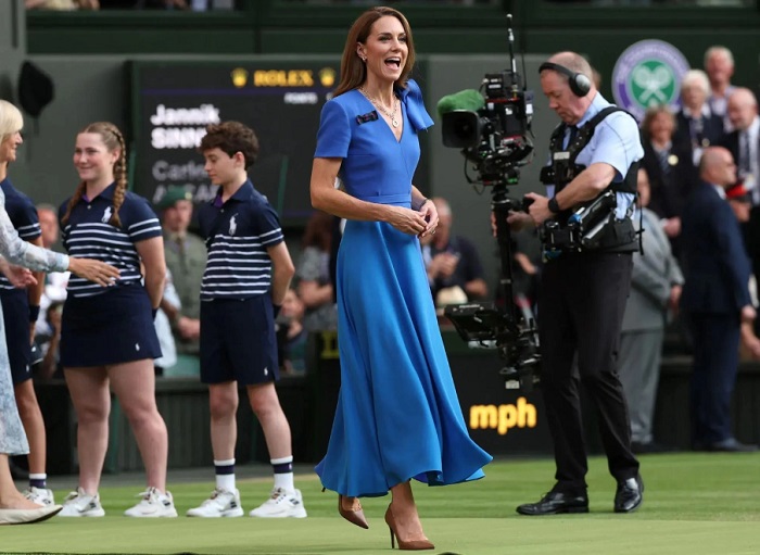 Окружающие замерли в ожидании реакции принцессы Уэльской. Кэтрин же непринужденно рассмеялась. Ничего удивительно, что 43-летняя Кейт продолжает покорять мужские сердца: на турнире она выглядела просто потрясающе в ярко-синем длинном платье и изящных туфельках бежевого цвета.