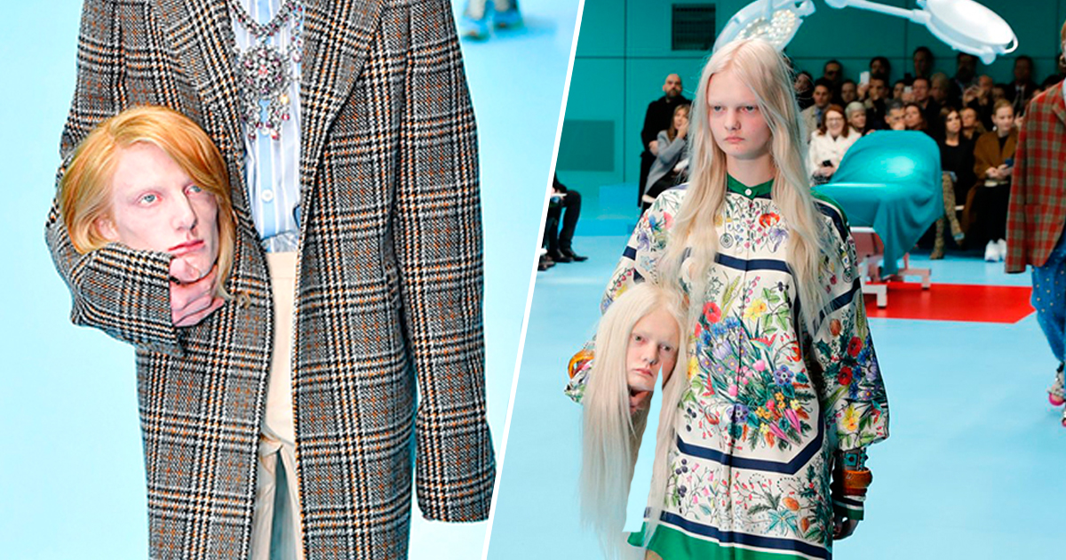 К тому, что наряды на показах высокой моды далеко от привычной одежды, которую большинство людей привыкли видеть каждый день, многие уже давно привыкли. Так, на подиуме уже ходили модели в нарядах из мусора, из пластика, в коконообразных одеяниях и прочих малопригодных в обычной жизни деталях одежды. Однако последний показ коллекции Осень/Зима от Gucci все же нашел способ шокировать публику: в этот раз они сместили вау-эффект с одежды на самих моделей, заставив их выйти с собственной головой под мышкой.
