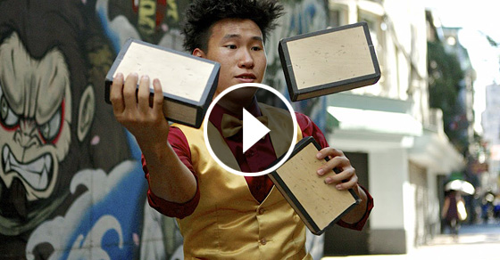 Глядя на то, как ловко этот парень справляется с сигарными коробками, можно поверить в несуществующие магниты, или даже третью руку жонглера! Нет, ну серьезно! Смотрите сами.