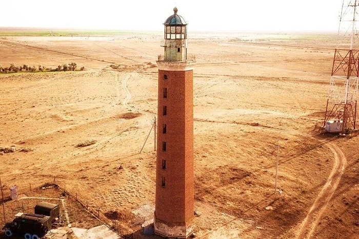 Из портов Каспийского моря прибывали корабли и останавливались здесь. В это трудно поверить сегодня, ведь вода давно ушла и маяк стоит посреди голой степи.