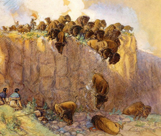 Схема была проста. Вначале выбиралось хорошее пастбище, неподалеку от которого располагался обрыв. Котлован углубляли, придавая ему V-образную форму, на дно выкладывали острые валуны. Один из аборигенов надевал на себя шкуру теленка и блеял, всячески стараясь обратить на себя внимание беспечно пасущегося стада. Как только ему удавалось увлечь животных, он начинал движение в сторону пропасти, тут же из засады выбегали и другие охотники, создавая «шумовую» атаку. Бизоны в панике продолжали двигаться к неминуемой гибели и прыгали в бездну, разбиваясь о скалы.