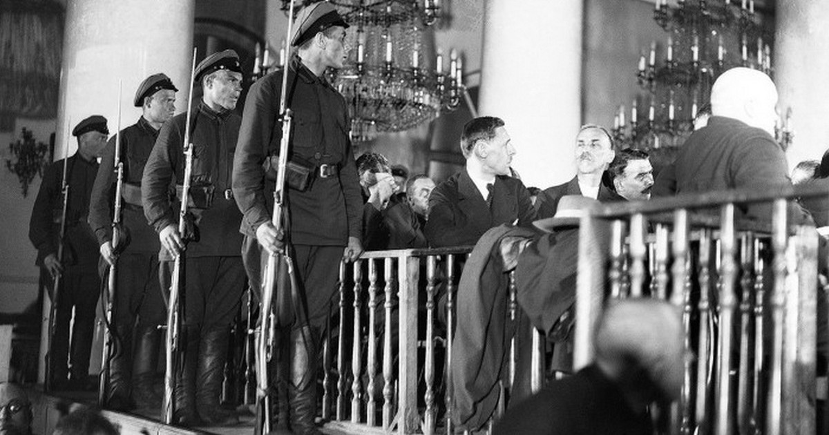 Обвиняемые во время процесса в Верховном суде СССР в Колонном зале Дома союзов по «делу Промпартии», 1930 год.