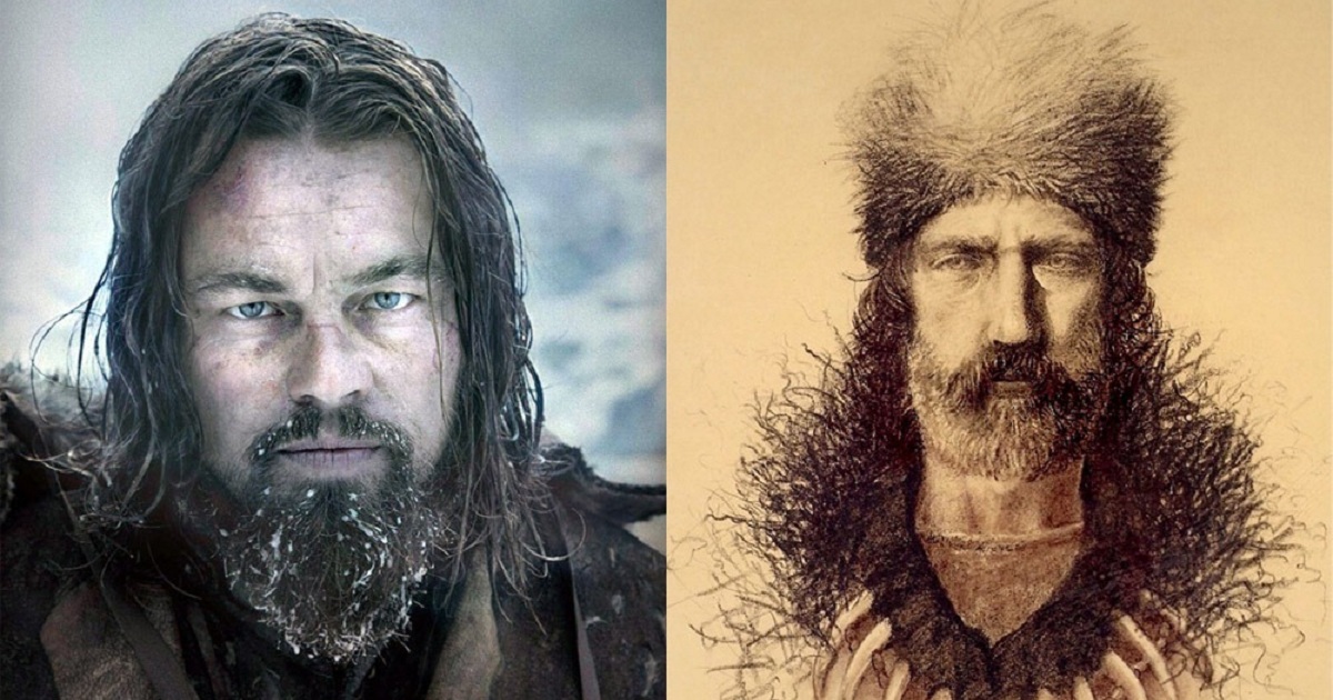 Леонардо ди Каприо в роли Хью Гласса из к/ф «Выживший» и портрет реального прототипа.