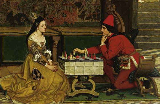 Картина похожа точь-в-точь на множеством парадных двойных портретов, где герои играют в шахматы – например, на портреты отцов и сыновей или двух друзей… Если не вглядываться слишком пристально. А вот если присмотреться, можно обнаружить, что мужчина справа, как раз делающий ход, очень напряжён и буквально вцепился в эфес своего меча.