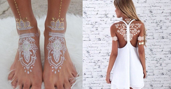 В то время, как одни люди покрывают свое тело постоянными татуировками, другие предпочитают временные украшения и рисунки. Это могут быть "металлические" наклейки, имитирующие кольца, браслеты и кулоны, это могут быть рисунки черной и рыжей хной. А теперь появились не то, чтобы абсолютно новые услуги, но все же несколько непривычные для нас - рисунки на коже белой хной, которые не столько напоминают об индийской культуре, сколько вызывают в памяти ажурные узоры изящных кружев. Это выглядит чрезвычайно женственно и очень привлекательно.