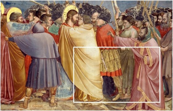Поцелуй Иуды, Джотто ди Бондоне , Падуя, капелла дель Арена, южная стена. \ Фото: aventurasnahistoria.uol.com.