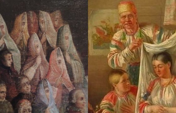 Но даже когда народ в основной массе отошел от допетровских традиций и привык к западной моде в одежде, оставались консервативные регионы. К примеру, в Тверской области национальные костюмы сохранялись долго. Большая часть женщин облачались в высокие кокошники с наброшенными на них платками. В московском Историческом музее хранится необычная картина «Смотрины в городе Торопце», свидетельствующая о том, что в православной России среди женщин существовала традиция закрывать лицо. На полотне почти все героини смотрят одним глазом. Создана работа предположительно в 18 веке неизвестным автором.