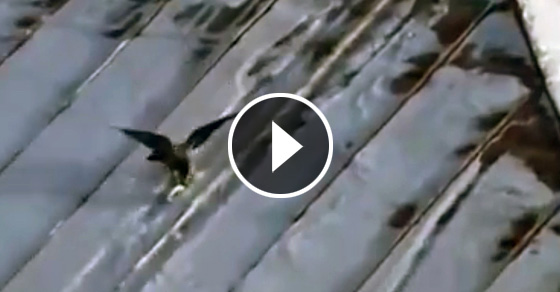Ворона с удовольствием катается с крыши.
