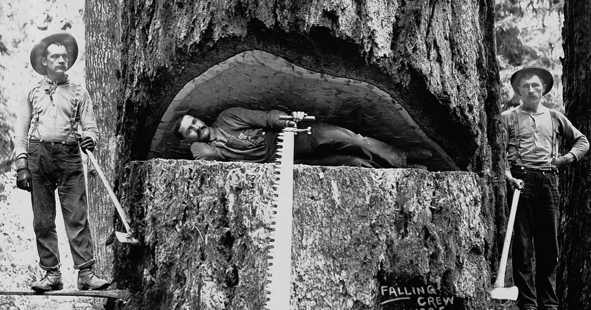 Отважные лесорубы и деревья невероятных размеров в ретро-снимках конца 19-начала 20 вв