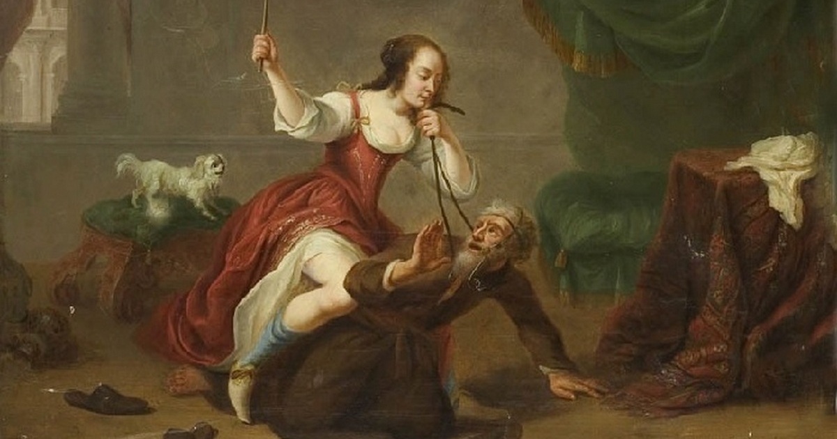 Куртизанка оседлала седого Аристотеля и тот, смирившись со своим унижением, катал ее по зеленым садовым аллеям. А в это время из окна за происходящим наблюдал сам Александр. На немой вопрос ученика смущенный Аристотель ответил: "Вот видишь, если она такое вытворяет со мной, старым, умудрённым человеком, то представляешь, во что она может превратить тебя".
