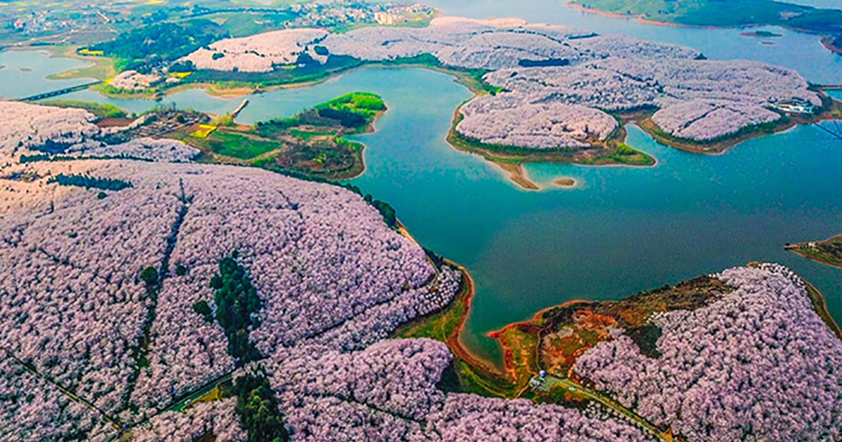 Судя по этим снимкам, цветение сакуры может стать национальным символом и достопримечательностью Китая наравне с Японией. На днях повсюду зацвели вишневые сады, и на аэрофотографиях они выглядят, словно бескрайнее море. Цветение продлится месяц, за это время у жителей страны и путешественников будет возможность насладиться прогулками.