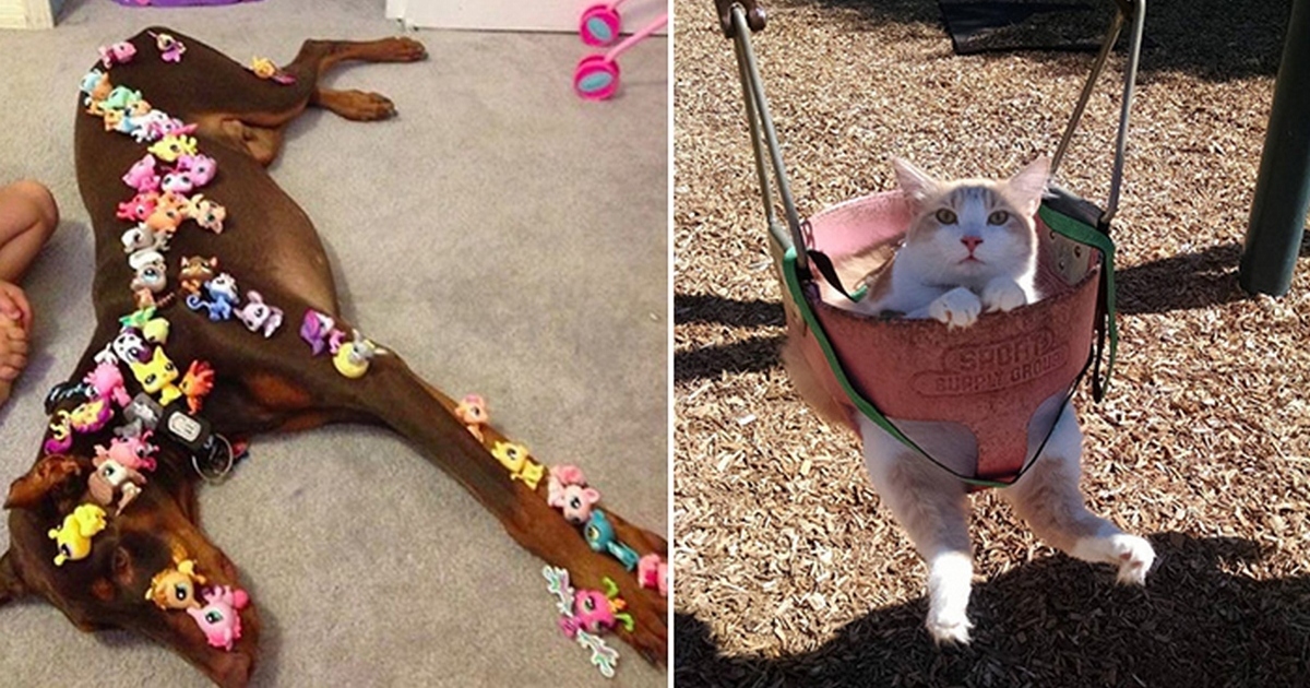 Если кому-то интересно, как выглядит терпение, то стоит понаблюдать за тем, как домашние животные безропотно терпят выходки детей. Кажется, они так обожают своих маленьких хозяев, что готовы простить им абсолютно всё. Ну кого же ещё детишки могут раскрасить, подстричь, накрасить, покачать на качелях или запихнуть в ползунки. Хвостатые сносят всё, а детишки активно этим пользуются.
