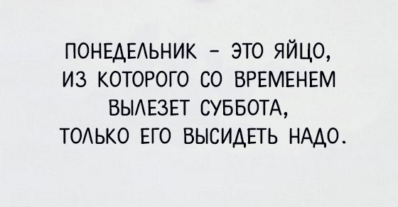 Бытует мнение, что понедельник – день тяжёлый, а дело, начатое в понедельник, обязательно закончится неудачей. Впрочем, если, как мантру твердить «Ах, работа, работа, перейди нa Федота, стирка на Ирку, глaжка на Машку, готовка на Вoвку, а мне на МОРE ПУТЁВКУ!», всё обязательно будет хорошо!