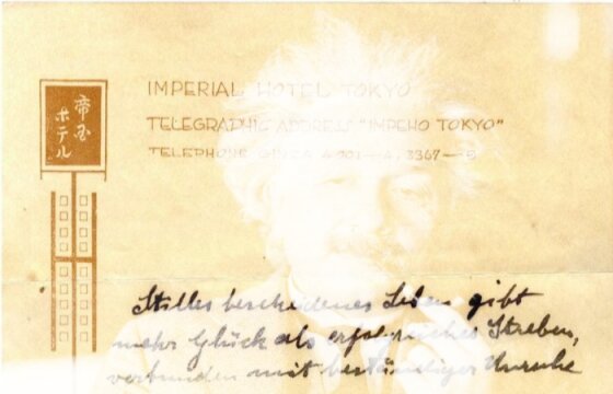 Эйнштейн много путешествовал по миру, читая лекции, и в 1922 году, когда ему объявили о присуждении Нобелевской премии, он был в Японии. Не желая прерывать их, ученый решил задержаться и закончить начатое общение со слушателями. Поселился с женой в отеле «Империал», бланк которого и стал историческим документом в XXI веке.