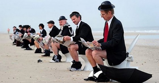 Вот этим событиям и посвящена работа Coalition of the Constipated от Эндрю Бэйнса. Для ее создания автор установил на одном из «диких» пляжей в окрестностях Хенли с десяток унитазов, на которые усадил десять человек в строгой, консервативной одежде.
