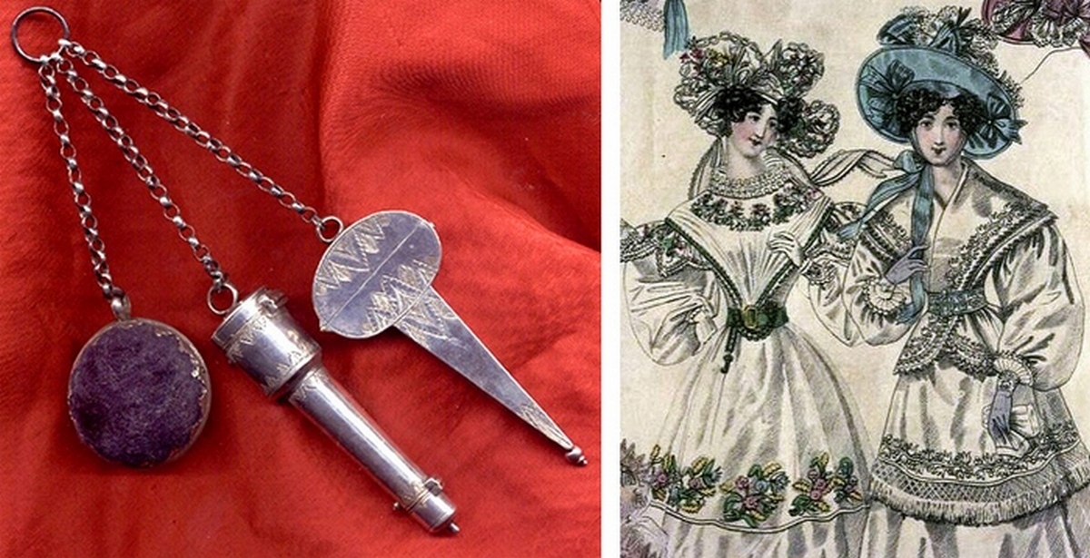 Слева очень ранний пример шатлена (1680 год) с подушечкой, комплектом иголок и наперстком, а также чехлом для ножниц. Справа иллюстрация из "Мира моды