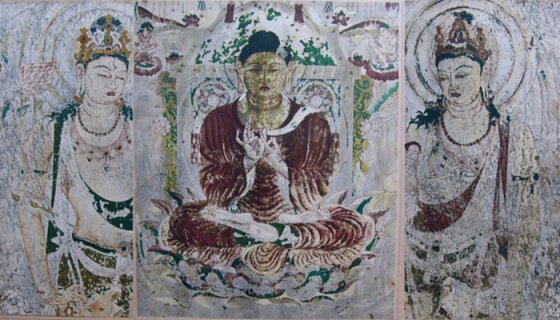 Композиция, состоящая из трех фигур, строго симметрична, образы предельно обобщены, но исполнены достоинства и величия. Будда Амида восседает на нежно-розовом бутоне лотоса, а бодхисатв окружают побеги этого священного цветка. Подобная иконография была характерна для буддийского искусства и встречается в скульптуре, декоративно-прикладном искусстве и живописи. Три фигуры объединены единым ритмом, рожденным в тонких, ясных и эффектных линиях контура и подчеркнутым выразительными позами и жестами и динамичными складками одежды. Язык фрески предельно декоративен и орнаментален.