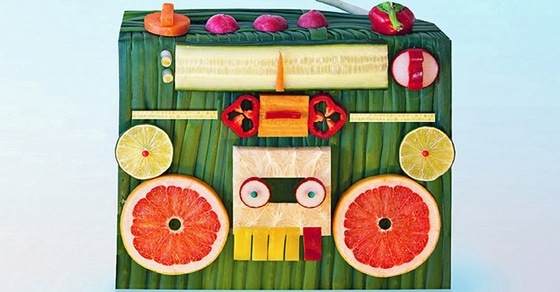 Его воображение часто превращает самую простую еду, такую как фрукты, овощи, семена и даже кусочками салями, в изысканные предметы искусства.