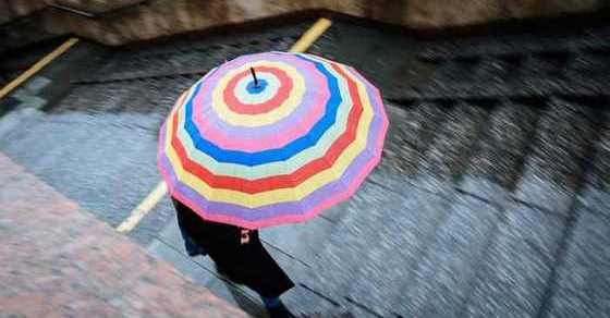 Яркий зонт привносит немного красок в пасмурный, дождливый день в центре Киева.