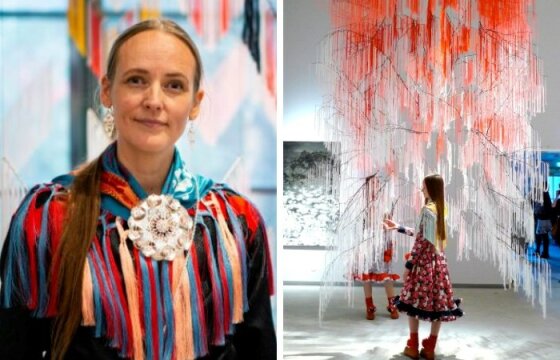 Ее холсты увешаны кистями, завязанными вручную в саамской технике дуоджи. Эти разноцветные нити не просто обрамляют ее картины, но и экзистенциально изменяют их, освещая создаваемые художницей ледяные миры жизнью и яркостью.