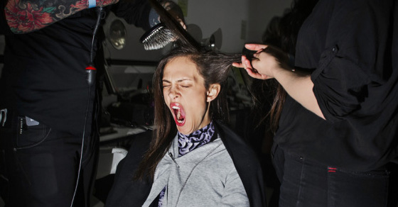 Модель зевает, пока готовится к модному показу Rodarte . Весна 2013 г. Нью-Йорк. Автор фото: Dina Litovsky.