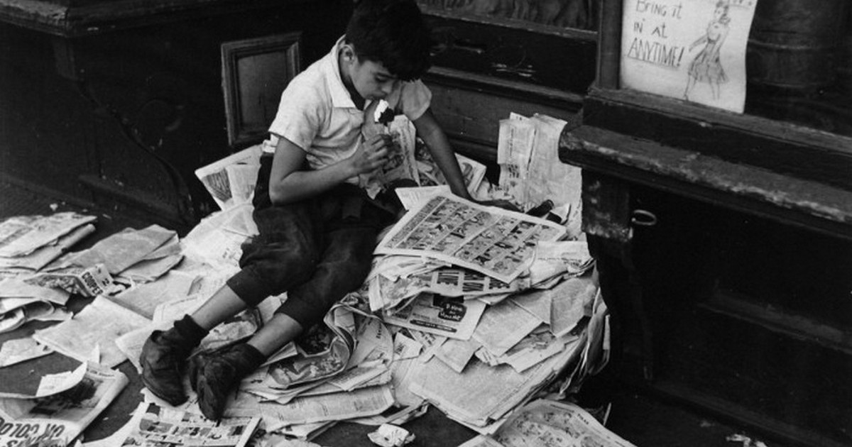 Мальчик с мороженым читает газету. США, Нью-Йорк, 1944 год.