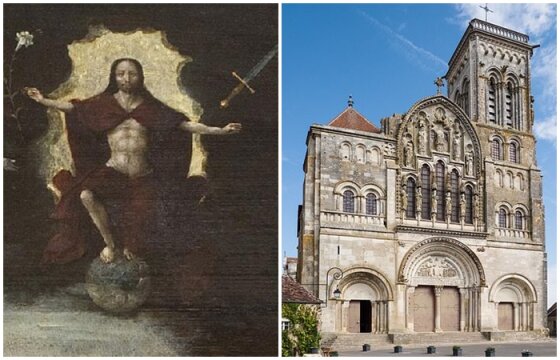 Аббатство Везеле, входящее в конгрегацию Клюни, было монастырем девятого века, обновленным в начале двенадцатого века и ещё раз в 1120 году после сильного пожара. Здание, вероятно, было построено по образцу Клюни II и хранило мощи Марии Магдалины. Как и другие средневековые европейские соборы, это базилика с выступающим трансептом, образующим поперечный план. Центральной частью его скульптурного убранства был рельеф над входом в наос церкви. Изображение состоит из Христа в мандорле, окружённого фигурами апостолов. Из пальцев Христа исходят огненные языки Святого Духа, как описано в Деяниях второго Нового Завета. По бокам расположены поля, занятые различными нехристианами, которых необходимо обратить в христианство. Темой был миссионерский долг апостолов, посланных Христом и принятых на себя Святым Духом. В 1146 году перед этой церковью и образом святой Бернард Клервосский проповедовал о начале Второго крестового похода. Он также призвал европейскую аристократию и королевские семьи заняться своей собственной христианской миссией.