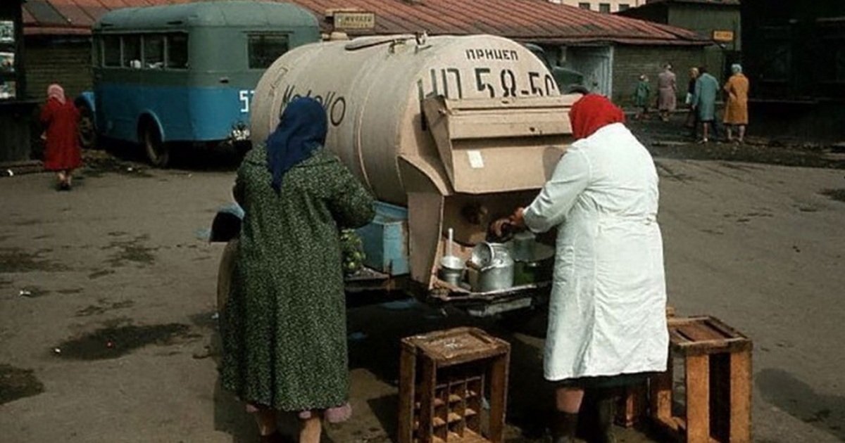Женщина, торгующая молоком на рынке. СССР, 1967 год.